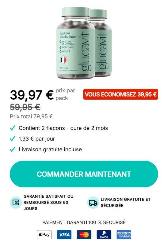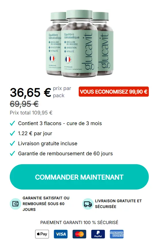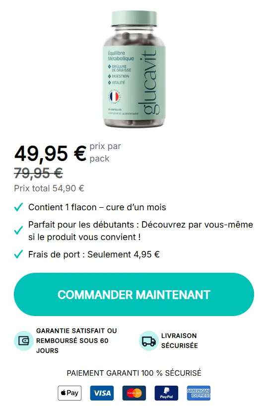 Et si notre avis ne suffit pas à vous convaincre, sachez que Glucavit est protégé par une garantie de satisfaction. Vous pouvez donc l’essayer sereinement et constater vous-même comment votre corps réagit, sans stress ni engagement à long terme.