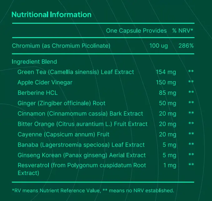 Elle associe des ingrédients essentiels reconnus pour leur rôle dans la gestion du glucose, comme l’acide alpha-lipoïque, qui contribue à la sensibilité à l’insuline et à l’utilisation du sucre par les cellules ; la cannelle, souvent étudiée pour son impact sur la régulation glycémique ; et le chrome, un minéral clé impliqué dans le maintien d’un taux de sucre normal dans le sang.